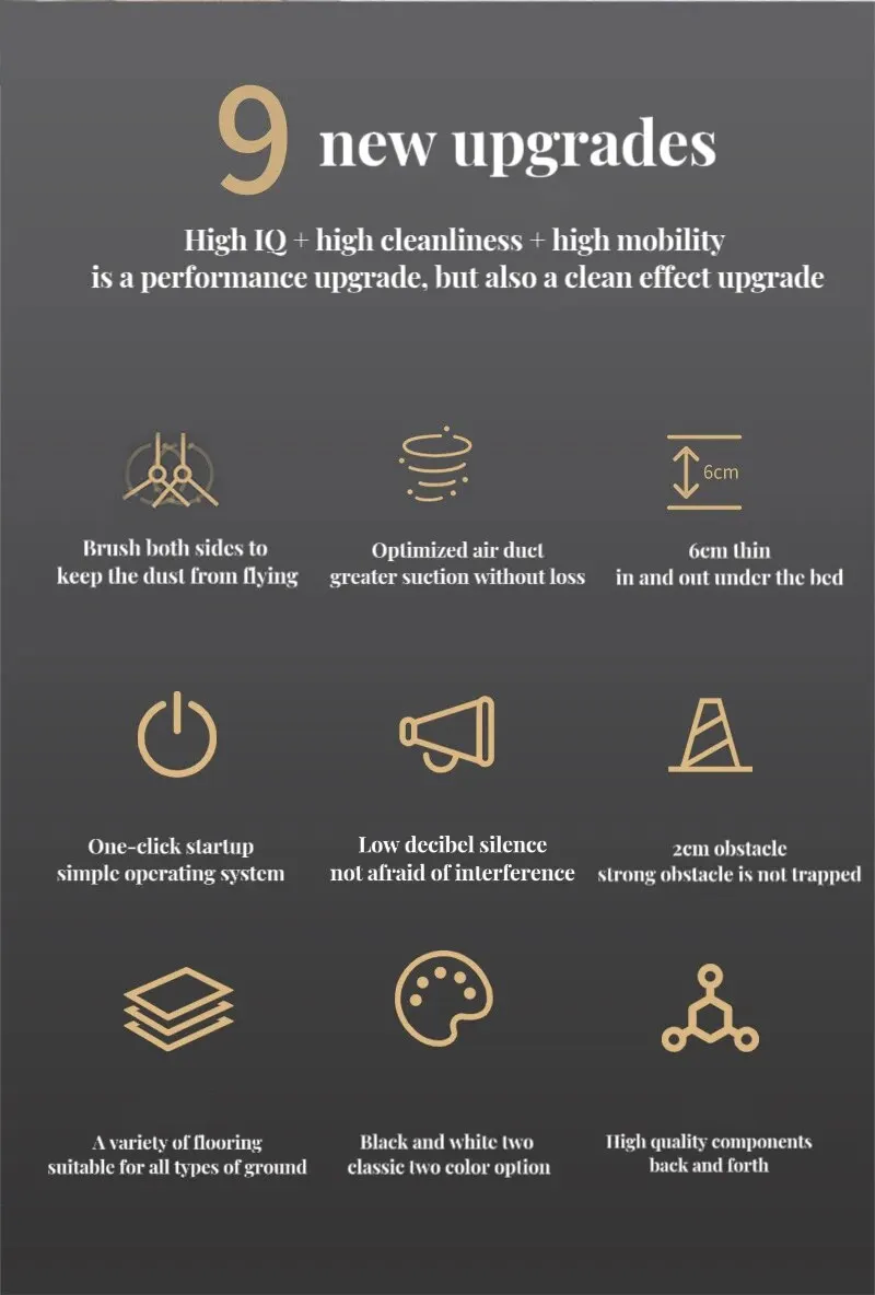 • Intelligent Cleaning :This intelligent sweeping robot efficiently cleans your house, reducing your manual work and ensuring a tidy home.